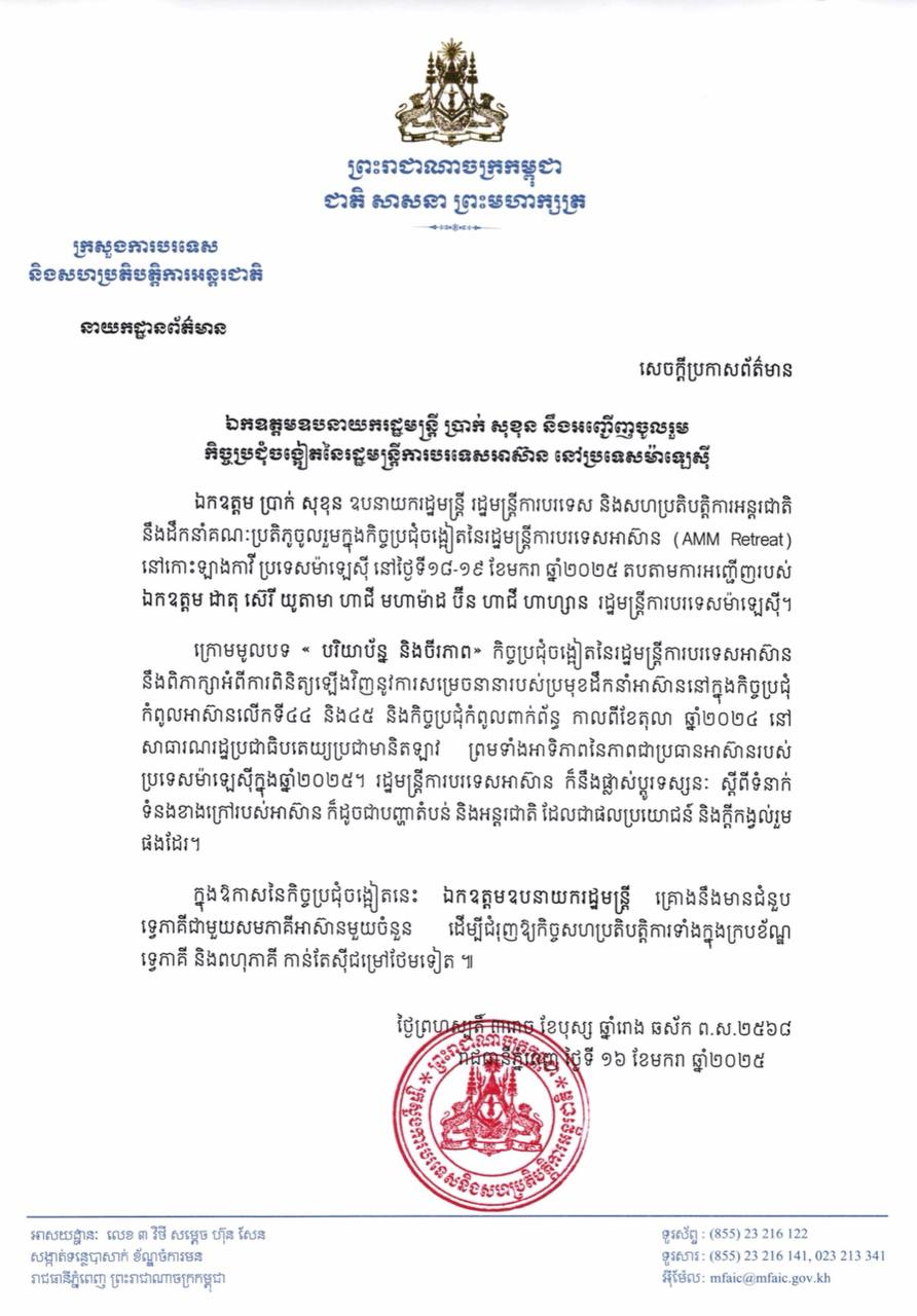 ឯកឧត្តម ប្រាក់ សុខុន ឧបនាយករដ្ឋមន្ត្រី រដ្ឋមន្ត្រីការបរទេស និងសហប្រតិបត្តិការអន្តរជាតិ នឹងដឹកនាំគណៈប្រតិភូចូលរួមក្នុងកិច្ចប្រជុំចង្អៀតនៃរដ្ឋមន្ត្រីការបរទេសអាស៊ាន (AMM Retreat) នៅកោះឡាងកាវី ប្រទេសម៉ាឡេស៊ី នៅថ្ងៃទី១៨-១៩ ខែមករា ឆ្នាំ២០២៥ តបតាមការអញ្ជើញរបស់ ឯកឧត្តម ដាតុ ស៊េរី យូតាមា ហាជី មហាម៉ាដ ប៊ីន ហាជី ហាហ្សាន រដ្ឋមន្ត្រីការបរទេសម៉ាឡេស៊ី។