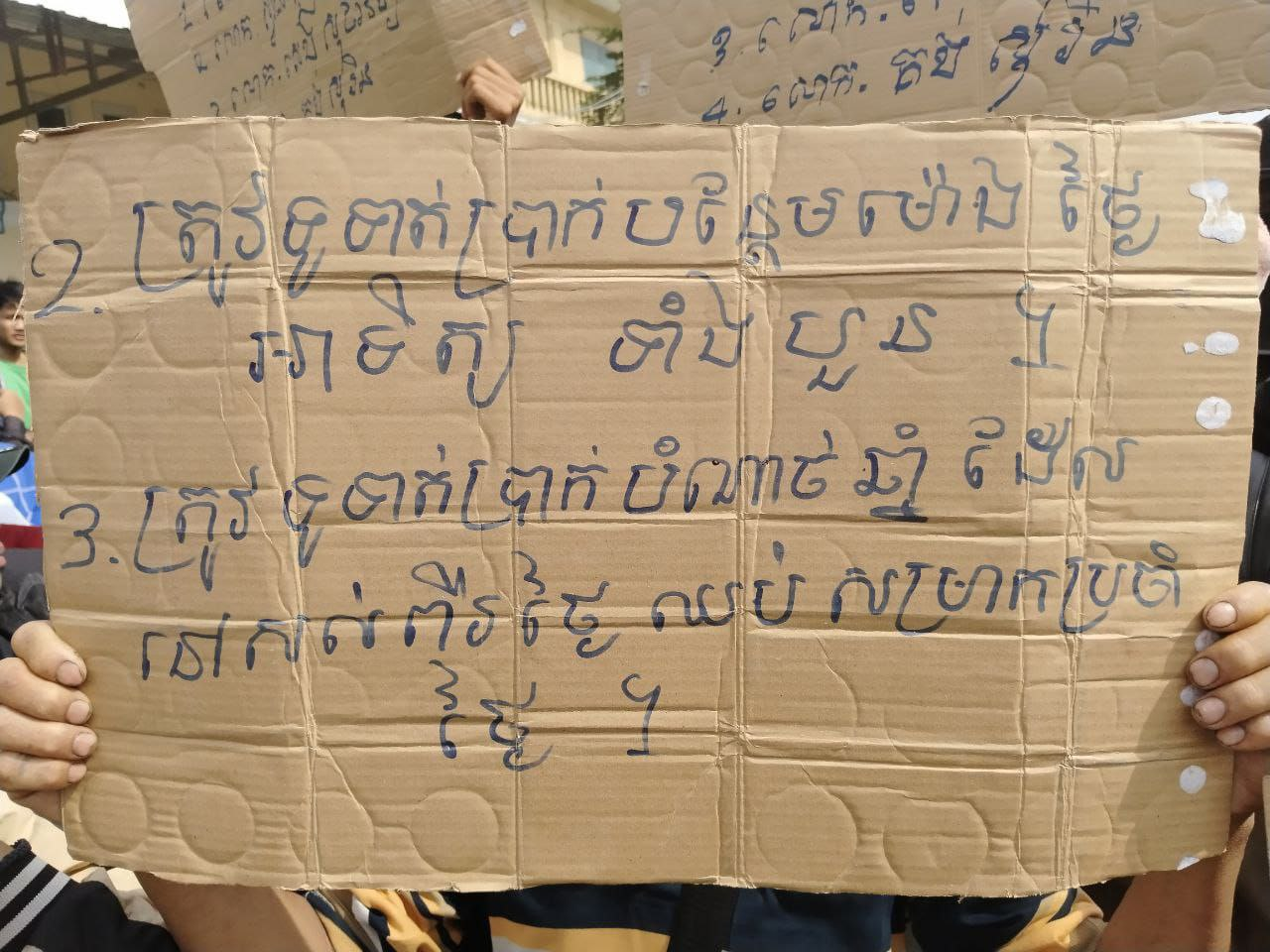 ស្នើសុំអោយបង្កើតសហជីព ស្នើសុំឡើងប្រាក់ខែក្នុង១ឆ្នាំឡើងម្តងតាមគោលការណ៍ក្រសួងការងារ ស្នើសុំលុយបំណាច់ឆ្នាំ និងអតីតភាពការងារ សុំឈប់១ខែចំនួន៤ថ្ងៃប៉ុន្តែសុំអូធី.ថ្ងៃអាទិត្យ។
