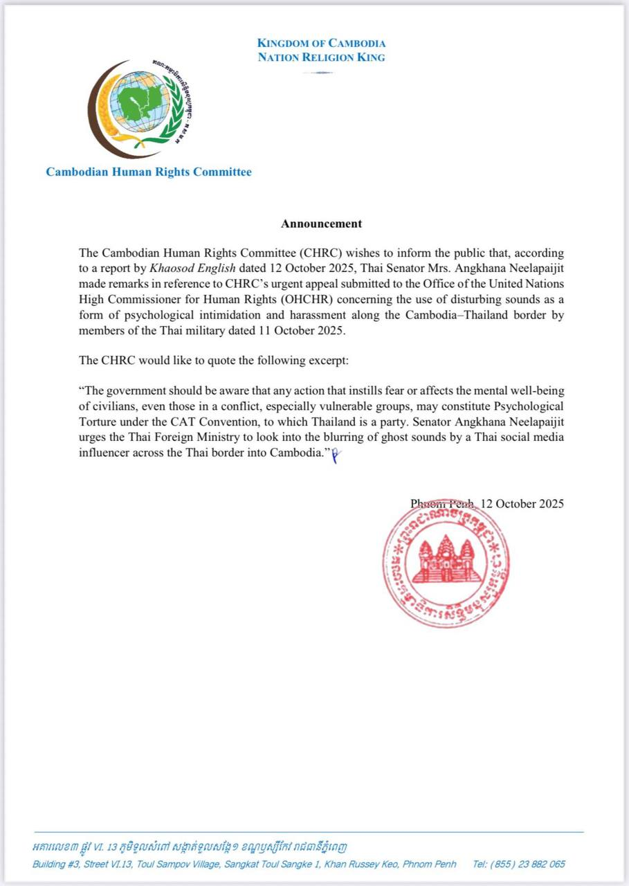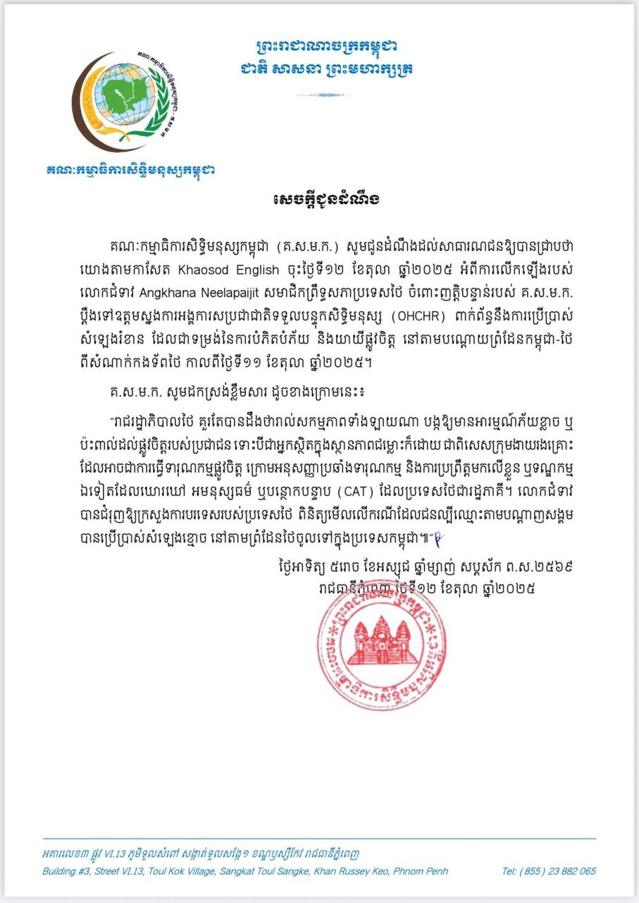 គណៈកម្មាធិការសិទ្ធិមនុស្សកម្ពុជា (គ.ស.ម.ក.) ចេញសេចក្តីជូនដំណឹង អំពីការលើកឡើងរបស់ លោកជំទាវ Angkhana Neelapaijit សមាជិកព្រឹទ្ធសភាប្រទេសថៃ ចំពោះញត្តិបន្ទាន់របស់ គ.ស.ម.ក. ប្តឹងទៅឧត្តមស្នងការអង្គការសប្រជាជាតិទទួលបន្ទុកសិទ្ធិមនុស្ស (OHCHR) ពាក់ព័ន្ធនឹងការប្រើប្រាស់ សំឡេងរំខាន ដែលជាទម្រង់នៃការបំភិតបំភ័យ និងយាយីផ្លូវចិត្ត នៅតាមបណ្តោយព្រំដែនកម្ពុជា-ថៃ ពីសំណាក់កងទ័ពថៃ កាលពីយប់ថ្ងៃទី១១ ខែតុលា ឆ្នាំ២០២៥
