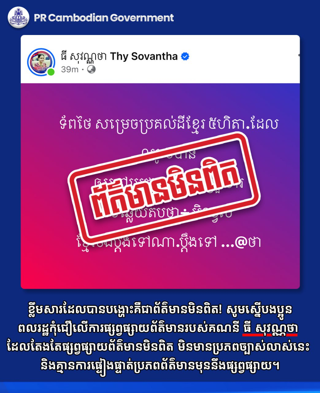 សូមស្នើបងប្អូនពលរដ្ឋកុំជឿលើការផ្សព្វផ្សាយព័ត៌មានរបស់គណនី ធី សុវណ្ណថា ដែលតែងតែផ្សព្វផ្សាយព័ត៌មានមិនពិត មិនមានប្រភពច្បាស់លាស់នេះ និងគ្មានការផ្ទៀងផ្ទាត់ប្រភពព័ត៌មានមុននឹងផ្សព្វផ្សាយ។