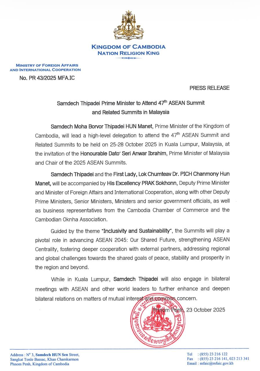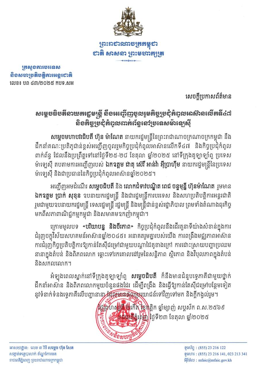 សម្តេចធិបតីនាយករដ្ឋមន្ត្រី នឹងអញ្ជើញចូលរួមកិច្ចប្រជុំកំពូលអាស៊ានលើកទី៤៧ និងកិច្ចប្រជុំកំពូលពាក់ព័ន្ធនៅប្រទេសម៉ាឡេស៊ីSamdech Thipadei Prime Minister to Attend 47th ASEAN Summit and Related Summits in Malaysia