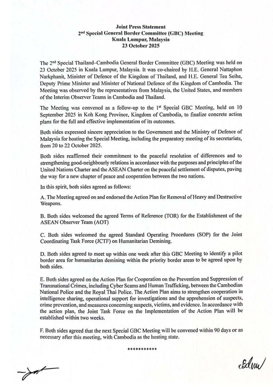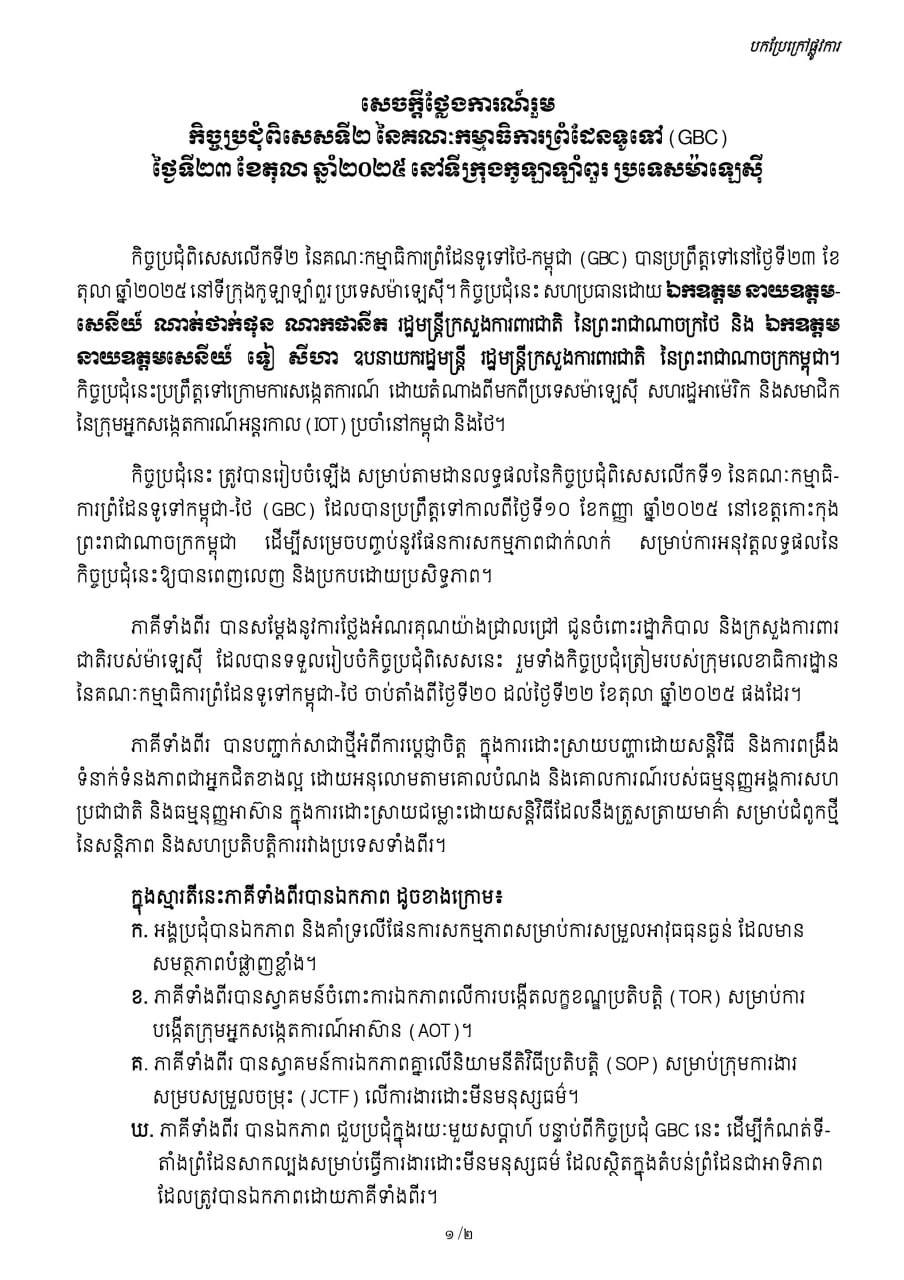 សេចក្តីថ្លែងការណ៍រួម កិច្ចប្រជុំពិសេសលើកទី២ នៃគណៈកម្មាធិការព្រំដែនទូទៅ (GBC) ថ្ងៃទី២៣ ខែតុលា ឆ្នាំ២០២៥ នៅទីក្រុងកូឡាឡាំពួរ ប្រទេសម៉ាឡេស៊ី