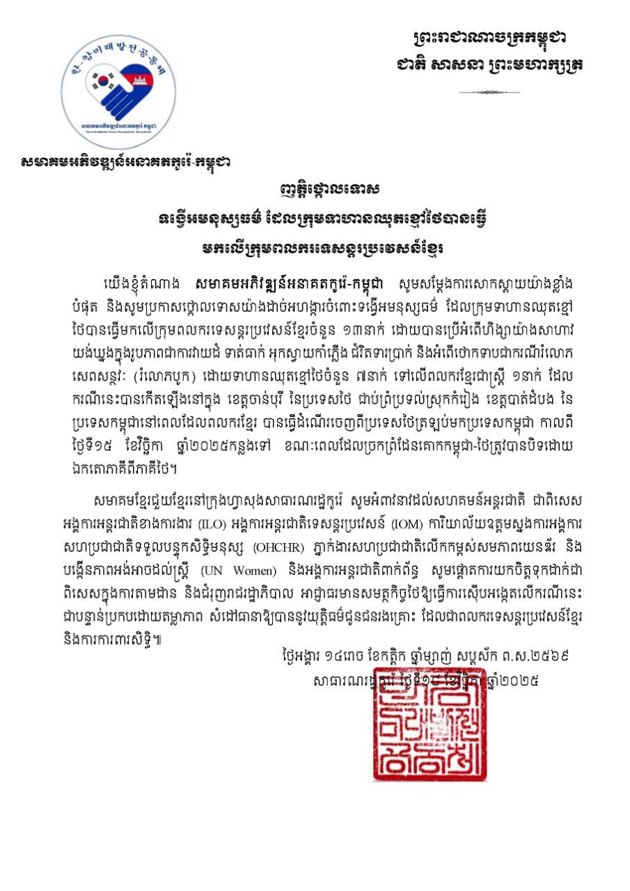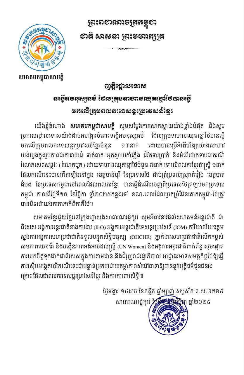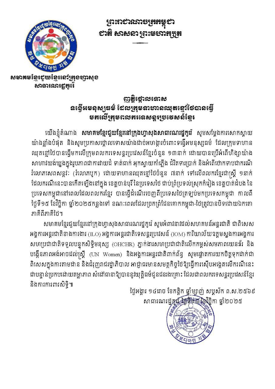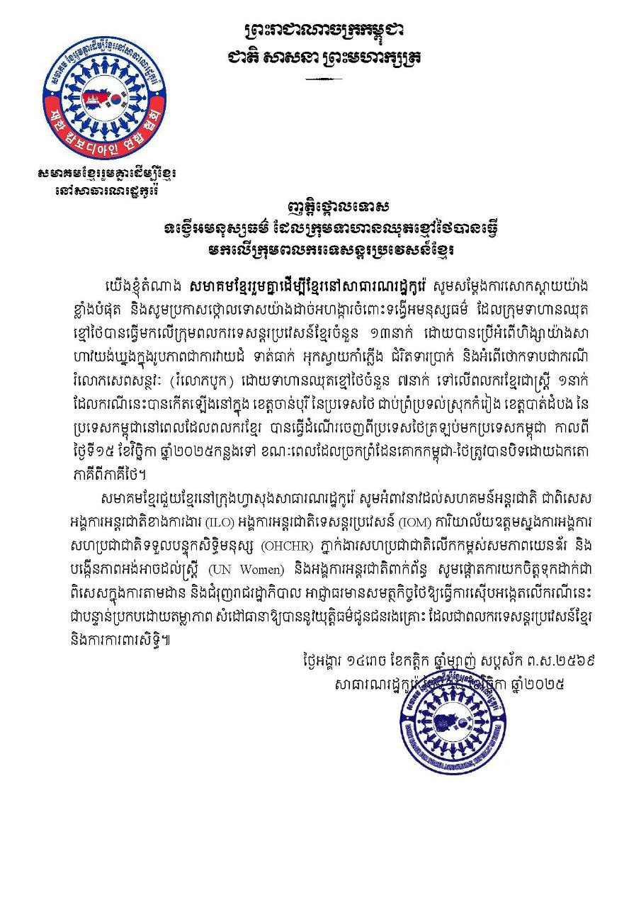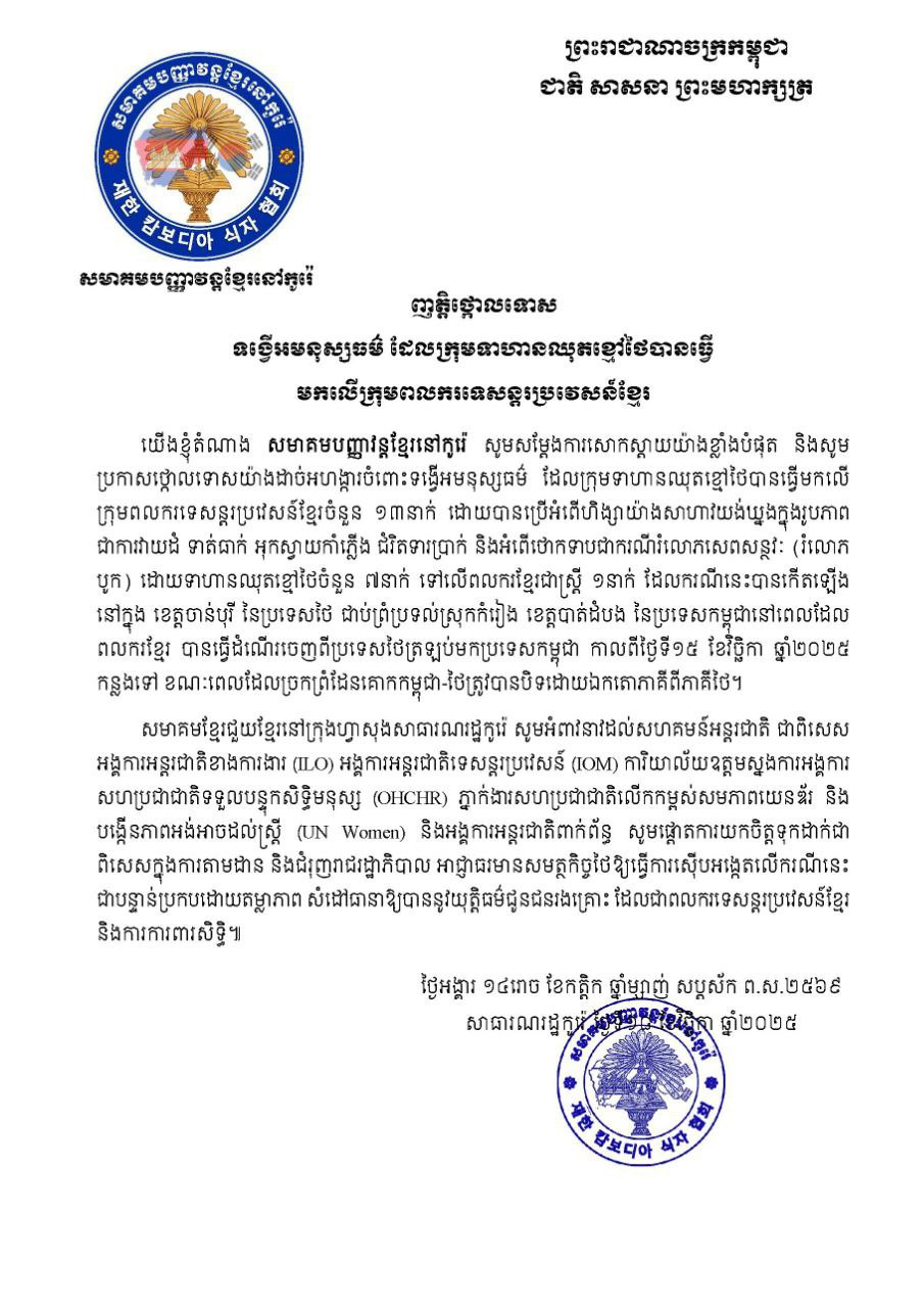 សមាគមខ្មែរចំនួន៦ នៅកូរ៉េខាងត្បូងចេញញត្តិថ្កោលទោសទង្វើអមនុស្សធម៌ដែលទាហានឈុតខ្មៅថៃបានធ្វើមកលើក្រុមពលករទេសន្តរប្រវេសន៍ខ្មែរ