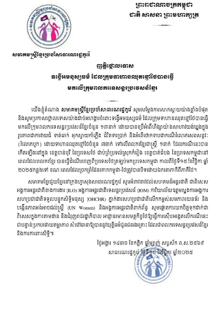 (ភ្នំពេញ)៖ សមាគមខ្មែរចំនួន៦ នៅរ៉េខាងត្បូង នៅថ្ងៃទី១៩ ខែវិច្ឆិកា ឆ្នាំ២០២៥នេះ បានចេញញត្តិដាច់ដោយឡែកពីគ្នាប្រកាសថ្កោលទោសយ៉ាងដាច់អហង្ការចំពោះទង្វើអមនុស្សធម៌ ដែលក្រុមទាហានឈុតខ្មៅថៃបានធ្វើមកលើក្រុមពលករទេសន្តរប្រវេសន៍ខ្មែរចំនួន ១៣នាក់ និងអំពើថោកទាបជាករណីរំលោភសេពសន្ថវៈយ៉ាងព្រៃផ្សៃ។