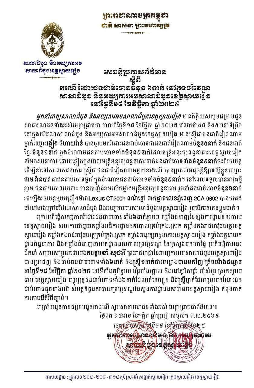អ្នកនាំពាក្យសាលាដំបូង និងអយ្យការអមសាលាដំបូងខេត្តស្វាយរៀង បានឲ្យដឹងថា កាលពីថ្ងៃទី១៨ ខែវិច្ឆិកា ឆ្នាំ២០២៥ វេលាម៉ោង៨ និង៥២នាទីព្រឹក នៅក្នុងបរិវេណសាលាដំបូង និងអយ្យការអមសាលាដំបូងខេត្តស្វាយរៀង មានស្ត្រីជាជនជាតិវៀតណាម ម្នាក់ឈ្មោះង្វៀង ធីហាយវ៉ាន់ បានចូលមករំដោះជនជាប់ចោទជាជនជាតិវៀតណាមចំនួន៥នាក់ និងជនជាតិ ខ្មែរចំនួន១នាក់ ក្នុងចំណោមជនជាប់ចោទទាំងចំនួន៩នាក់ដែលមន្ត្រីអនុរក្សពន្ធនាគារខេត្តស្វាយរៀង នាំមកសវនាការ ដោយឆ្លៀតក្នុងពេលមន្ត្រីអនុរក្សពន្ធនាគារដាក់ជនជាប់ចោទទាំងចំនួន៩នាក់ចុះពីរថយន្ត ដើម្បីនាំទៅសាលសវនាការ ស្ត្រីជាជនជាតិវៀតណាមម្នាក់ខាងលើ បានប្រគល់អាវុធខ្លីឱ្យទៅប្តីខ្លួនឈ្មោះ ផាម វ៉ាន់បាវ ជាជនជាប់ចោទម្នាក់ក្នុងចំណោមជនជាប់ចោទទាំងចំនួន៩នាក់។