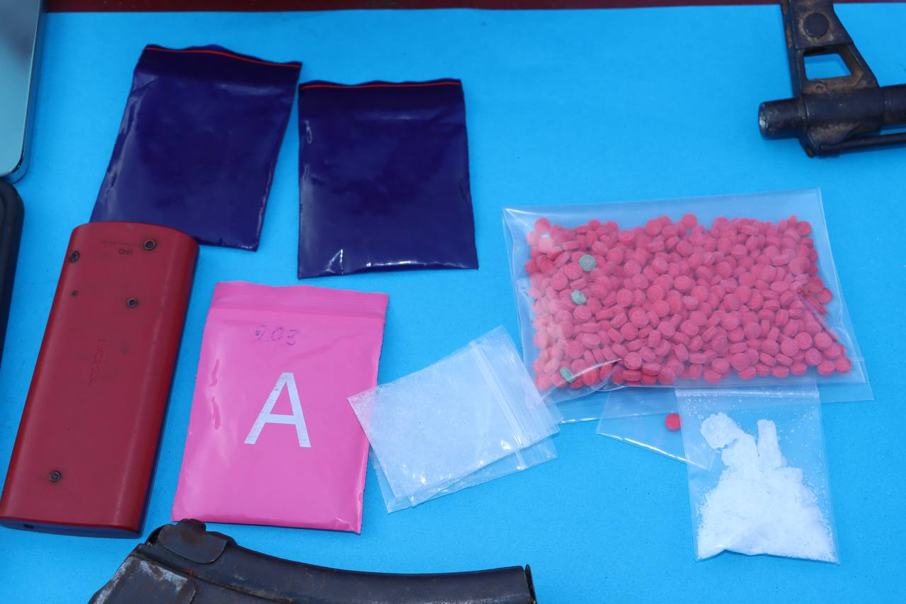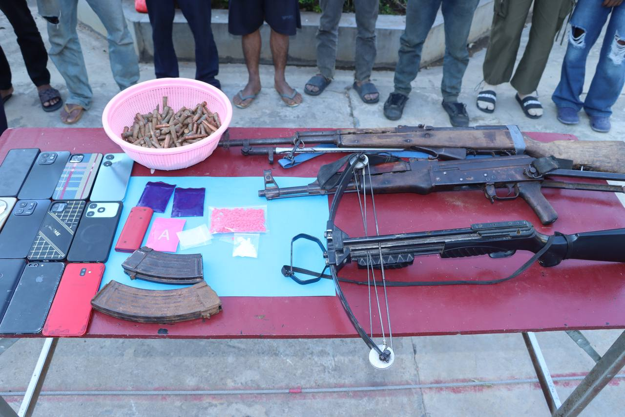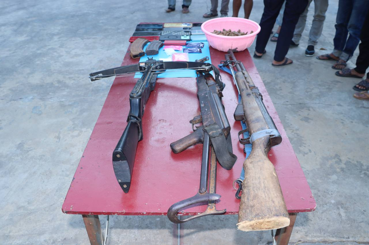 -ស្នាបាញ់គ្រាប់ឃ្លីដែក ចំនួន១ដើម, បង់កាំភ្លើងចំនួន២, គ្រាប់កាំភ្លើងប្រភេទ AK ចំនួន១៤៤គ្រាប់ ដាវស៊ាំម៉ូរ៉ៃ ចំនួន១ដើម, ទូរស័ព្ទ ចំនួន១៤គ្រឿង រួមនឹងថង់សម្រាប់ច្រកគ្រឿងញៀនមួយចំនួន។