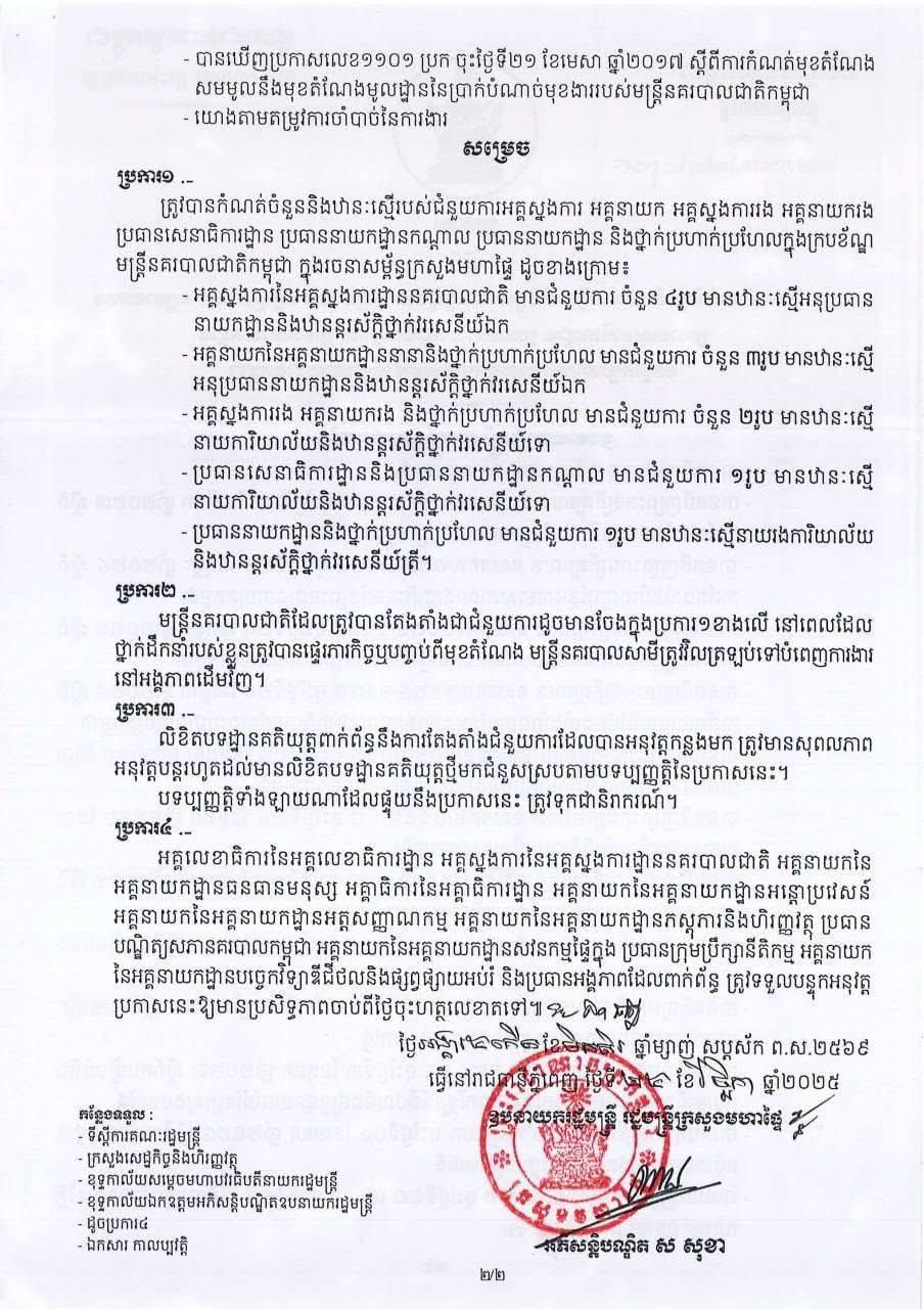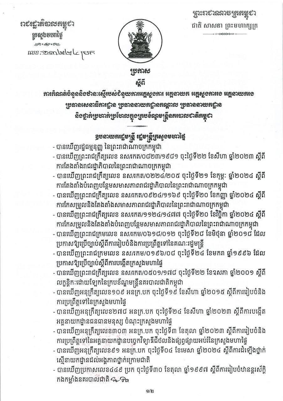 ក្រសួងមហាផ្ទៃចេញប្រកាសស្ដីពីការកំណត់ចំនួននិងឋានៈស្មើរបស់ជំនួយការអគ្គស្នងការ អគ្គនាយក អគ្គស្នងការរង អគ្គនាយករង ប្រធានសេនាធិការដ្ឋាន ប្រធាននាយកដ្ឋានកណ្តាល ប្រធាននាយកដ្ឋាន និងថ្នាក់ប្រហាក់ប្រហែលក្នុងក្របខ័ណ្ឌមន្ត្រីនគរបាលជាតិកម្ពុជា។